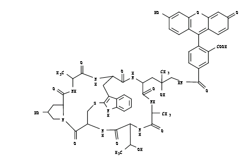 這種綠色熒光鬼筆環(huán)肽綴合物(相當(dāng)于FITC標(biāo)記的鬼筆環(huán)肽)會選擇性結(jié)合F-肌動蛋白。鬼筆環(huán)肽衍生物經(jīng)常以納摩爾濃度使用,常在甲醛固定和透化的組織切片、細(xì)胞培養(yǎng)或無細(xì)胞實(shí)驗(yàn)中用于標(biāo)記、鑒定和定量F-肌動蛋白的便捷探針。